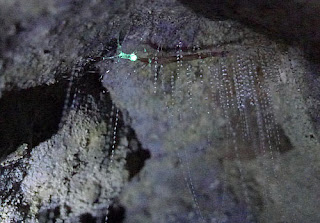 The glow-worms are actually no worms but larvae of a fly. They produce light to lure insects into the sticky traps they have build - a bit like spider webs. When an insect gets caught into them, the glow-worm eats it for dinner.